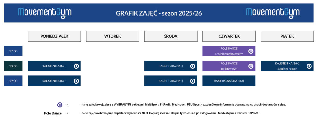| 18:00 | Kalistenika – początkujący | Pole dance – Low intermediate | Kalistenika – początkujący | |